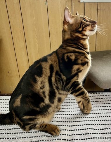 Aslan a été notre premier mâle reproducteur et nous a permis d'acceuillir nos premiers chatons Bengal. D'un caractère sociable et aimant, il était particulièrement à l'aise lors des expositions félines auxquelles il a participées.
